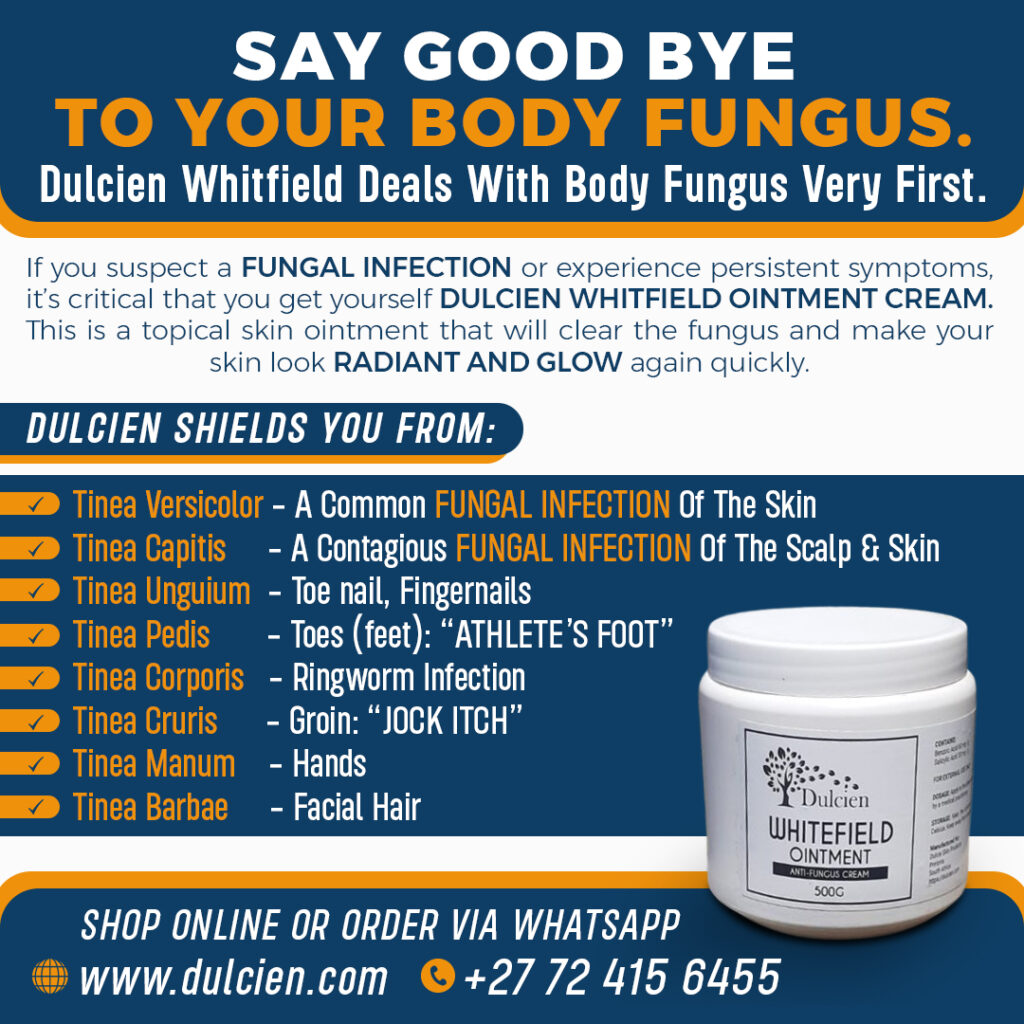 To keep your skin fungal-free, continue using Dulcien Whitfield Ointment cream at least twice a week even after it has cleared from your body. By doing this, you will remain bad fungal-free forever. Your skin is going to glow. You will not be ashamed of yourself.