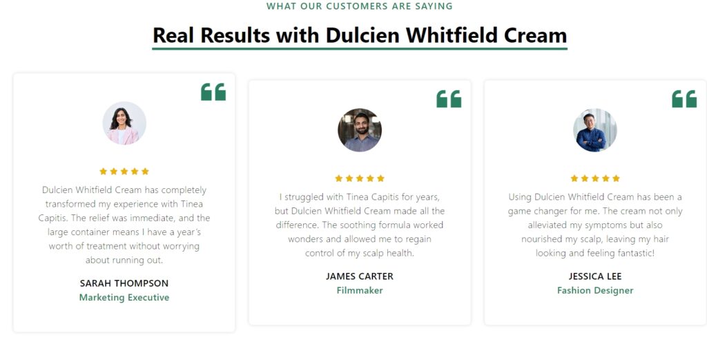 - Sarah M., 34, Mother of Two: “My kids caught ringworm at school, and the itching was unbearable. Dulcien Whitfield cleared the scaling in a week alongside their pills. The big tub lasted us through the whole ordeal—no recurrence!”